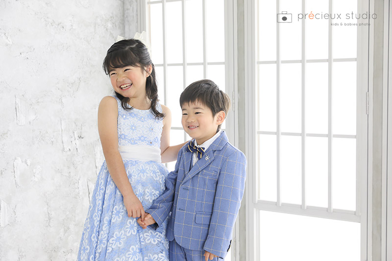 洋装の撮影でも、ごきょうだいで青色系に合わせたお衣装を選んでくれました!