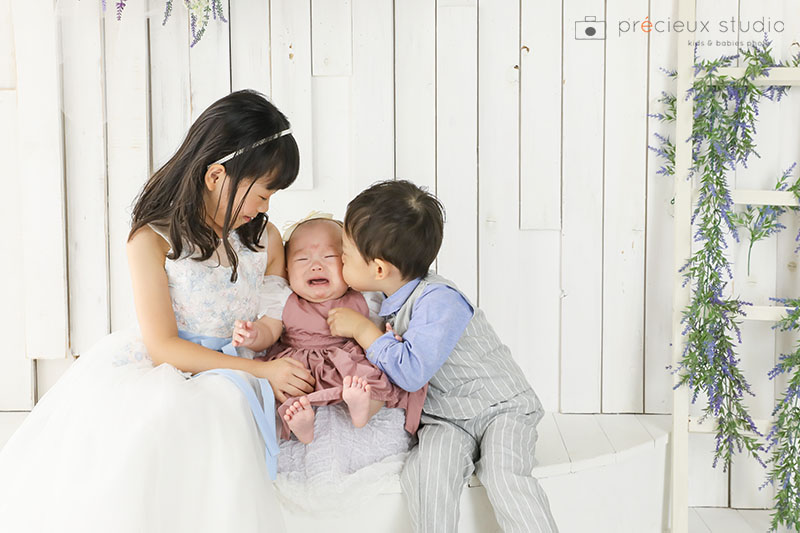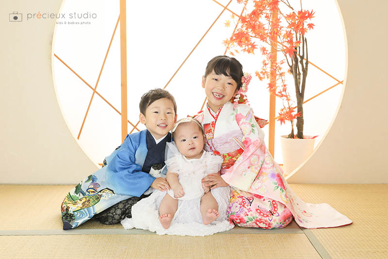七五三記念撮影とハーフバースデー撮影 3人で仲良くお祝い(プレシュスタジオ 自由が丘店)
