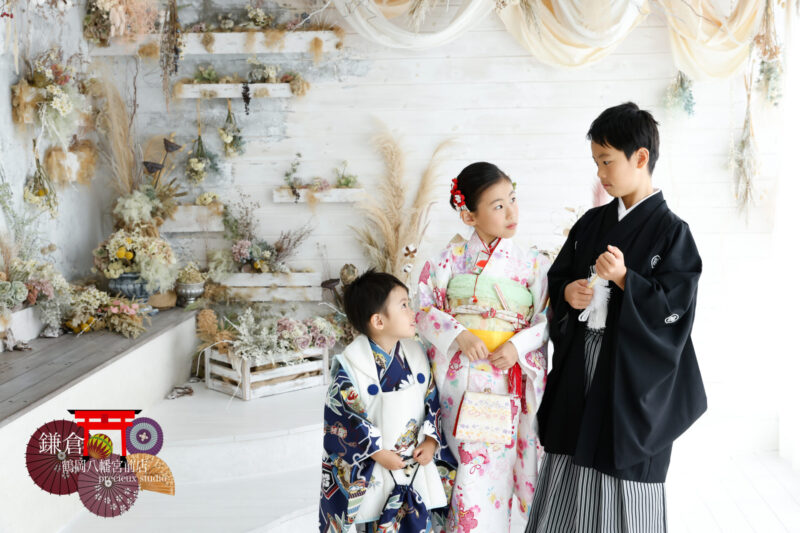 七五三スタジオ撮影*仲良しご兄弟全員でお着物写真(プレシュスタジオ 鎌倉鶴岡八幡宮前店)