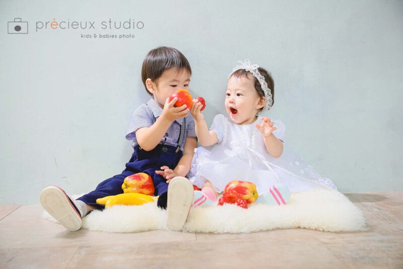 きょうだいの撮影では、果物のおもちゃを用意すると2人で仲良く