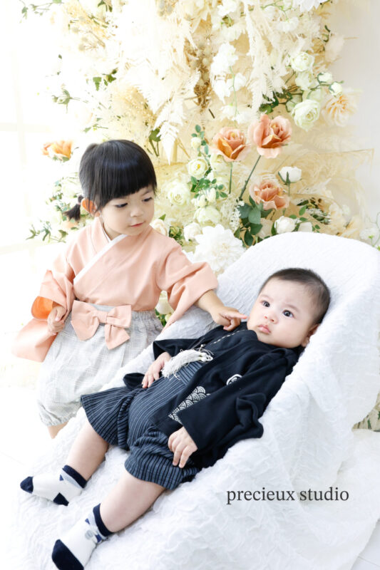 スタジオで七五三写真撮影*袴姿のお姉ちゃんと一緒に和装の女の子
