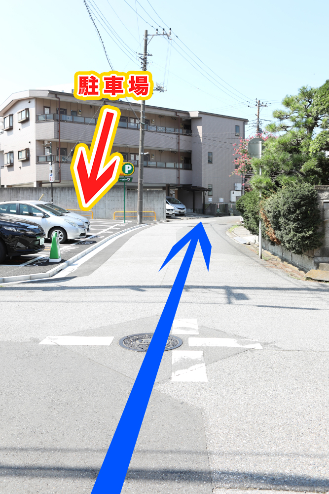 ⑦そのまま真っ直ぐに進みます。左手に駐車場が見えてきます。