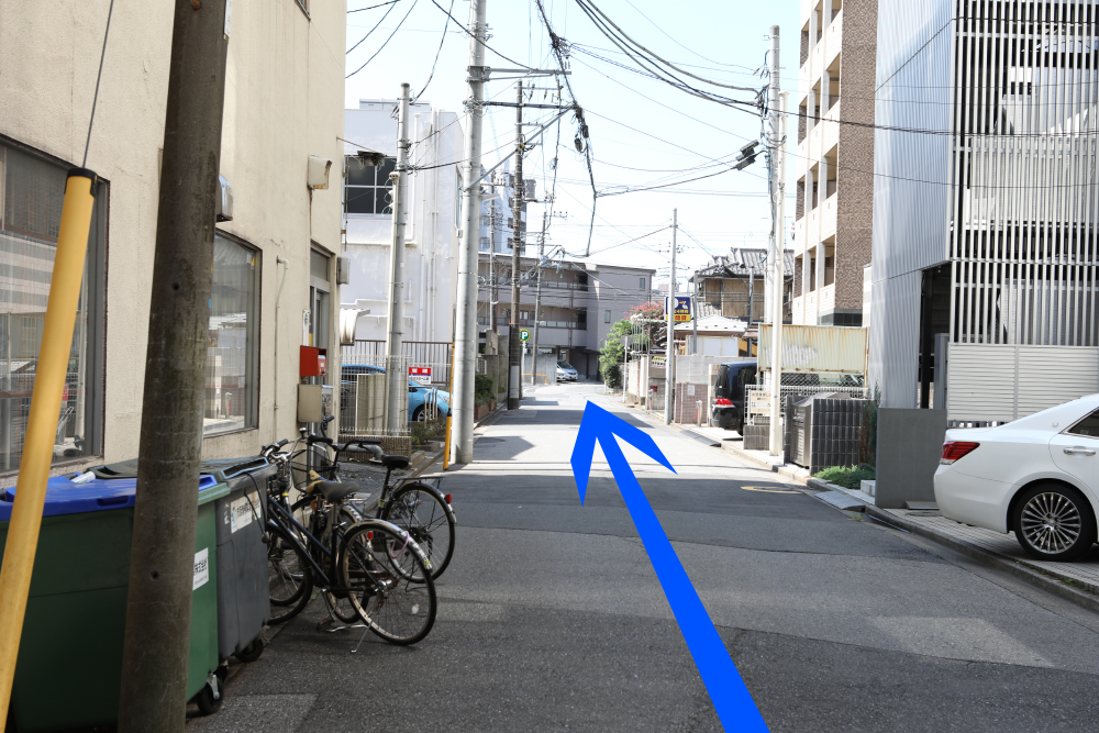 ⑧左手側に三井のリパークの駐車場がございます。お車でお越しの際は、こちらの月極め5番にお停めください。
