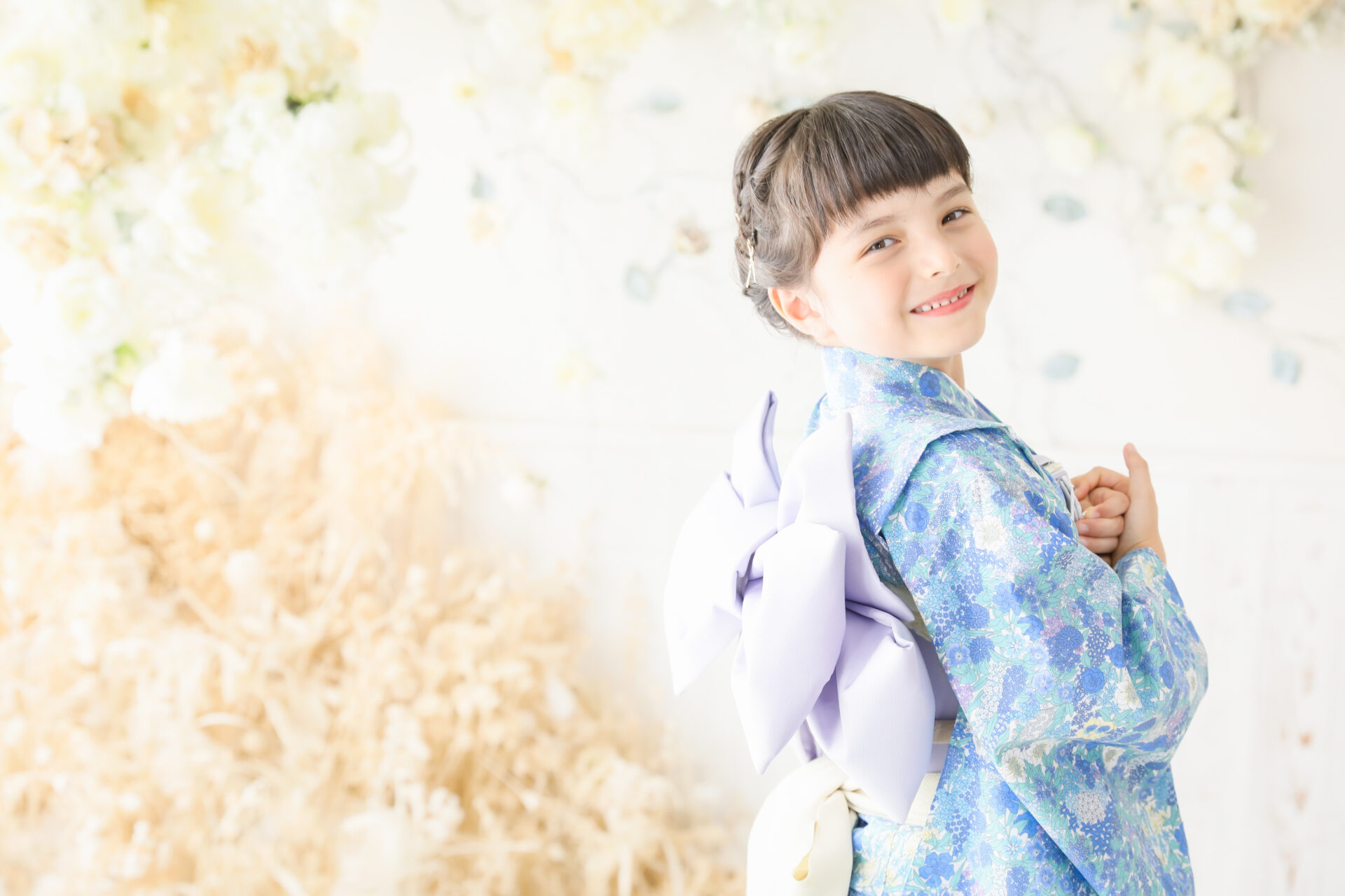 おしゃれで現代的な印象で、お花やモダンなインテリアのスタジオセットとも相性が良く写真映えするスタイルです。七五三の記念に着物を着せたいけれど、クラシックな雰囲気より今風のコーディネートを楽しみたいご家族におすすめです。